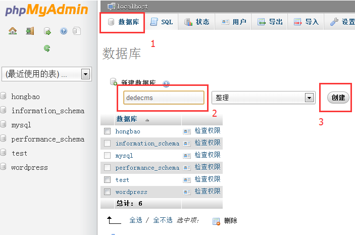 然后,打開MySQL的數據庫管理器,找到phpmyadmin,輸入控制面板的用戶名和密碼(都是root),然后創建一個網站的數據庫,比如我們可以創建一個名字為“dedecms的數據庫”,如圖。