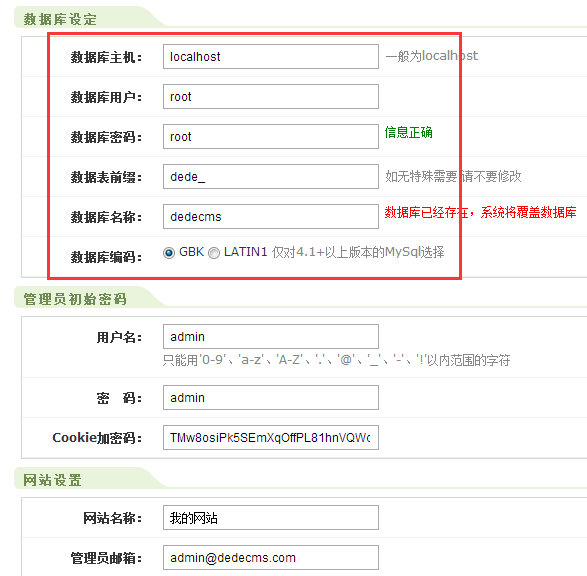接下來打開dedecms安裝程序,在瀏覽器中輸入http://localhost,根據程序的安裝指導進行安裝。因為我們是在本地環境進行安裝的,所以,服務器地址是:localhost數據庫的用戶名和密碼都是root。如圖
