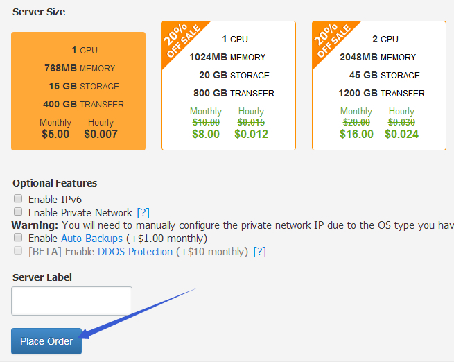 這里我們選擇VPS配置,內存、流量、硬盤是不同的,價格也不同,我們根據自己需要選擇。然后點擊PLACE ORDER開通。