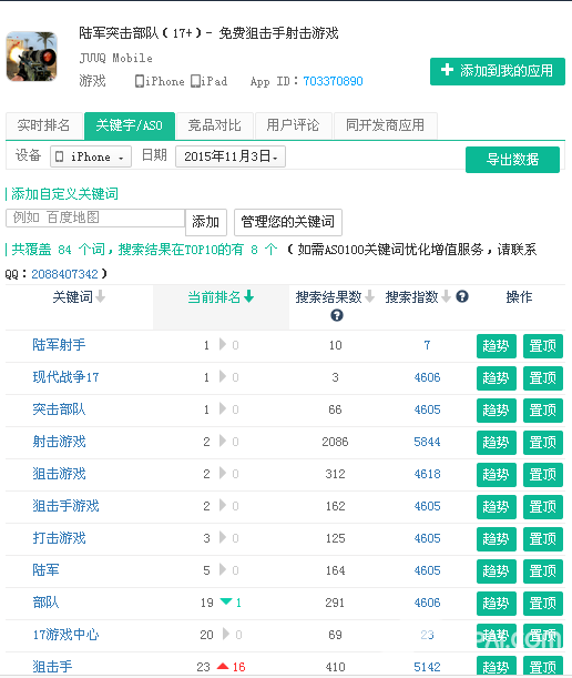 如果實在不知道選詞沒關系,競爭對手會告訴你,善于分析,勤于記錄,如果應用是一款戰爭游戲的話,那么射擊、射擊游戲、狙擊游戲、戰爭游戲等關鍵詞必然是目標用戶搜索最多的關鍵詞了,如圖所示:
