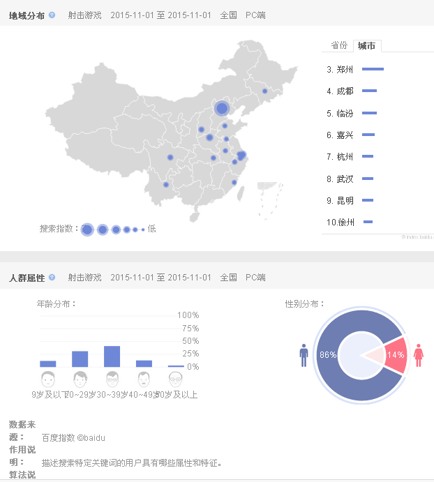 利用百度指數來分析關鍵詞也是一種常見的手段,通過百度指數我們可以得出搜索這組關鍵詞的熱度、人群比例,搜索地域分布等情況。