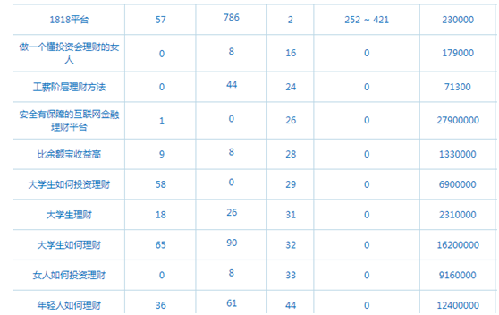 篩選關(guān)鍵詞是增加有排名關(guān)鍵詞數(shù)量的關(guān)鍵詞,首先選擇網(wǎng)站品牌關(guān)鍵詞的長尾詞、其次是選擇行業(yè)核心關(guān)鍵詞的長尾詞,建議選擇那些百度指數(shù)不超過100的來做,因為指數(shù)越大代表這個詞做上來的時間越長,做seo大多數(shù)詞是長尾詞,帶來流量的除了網(wǎng)站品牌詞就是核心關(guān)鍵詞的長尾詞了。例如優(yōu)本財富是做互聯(lián)網(wǎng)理財?shù)模袠I(yè)長尾詞就可以選擇"互聯(lián)網(wǎng)理財平臺"百度指數(shù)為92,這樣就容易取得好的排名。