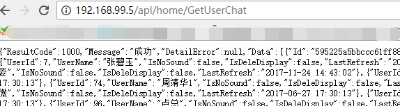 [Route("api/[controller]")]public class HomeController : Controller{// GET: api/<controller>[HttpGet,Route("GetUserChat")]public async Task<ActionResult> GetUserChat(){var collection = new MongoHelper().GetCollection<OAChat>("OAChat");var chatItems =await collection.Find(n => n.ChatType == 2).Limit(5).ToListAsync();return ApiJsonFormat.GetJsonResult(chatItems);}}