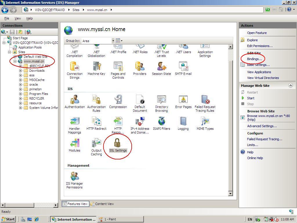 6.在左邊窗口選擇安裝證書的網(wǎng)站,然后在中間窗口,選擇“SSL Settings”,再在右邊窗口點(diǎn)擊“Bindings...”,如下圖: