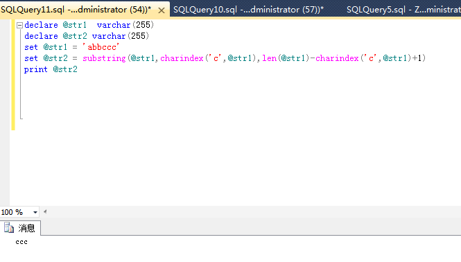set @str2 = substring(@str1,charindex('c',@str1),len(@str1)-charindex('c',@str1)+1)