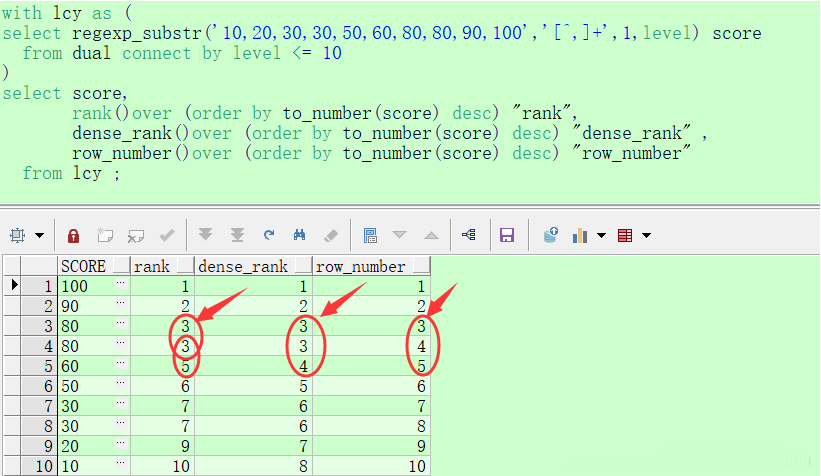 withlcyas(selectregexp_substr('10,20,30,30,50,60,80,80,90,100','[^,]+',1,level) scorefromdualconnectbylevel<= 10)selectscore,rank()over (orderbyto_number(score)desc)"rank",dense_rank()over (orderbyto_number(score)desc)"dense_rank",row_number()over (orderbyto_number(score)desc)"row_number"fromlcy ;