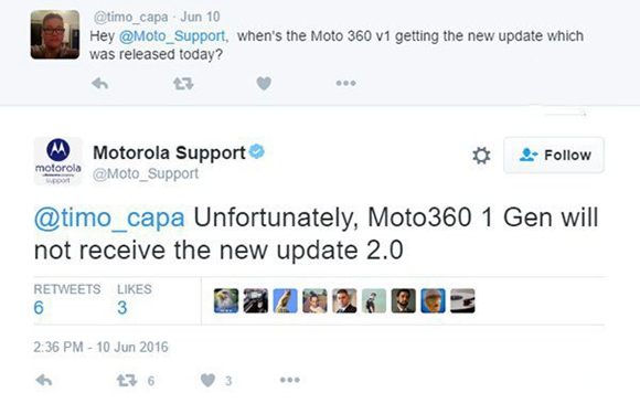 摩托羅拉在Twitter上正式回應了這一點,可能考慮到Moto360一代的配置、性能已經跟不上Android Wear 2.0所需。