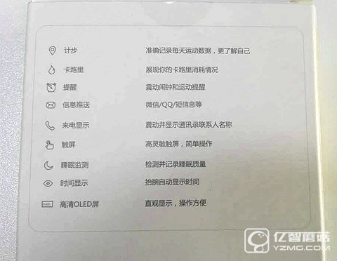 ▲背面是手環(huán)的主要功能簡介,除了基本的記步、卡路里、時(shí)間顯示功能外,還有消息推送、睡眠監(jiān)測、來電顯示等功能,這個(gè)在下面的功能體驗(yàn)中會(huì)有介紹。