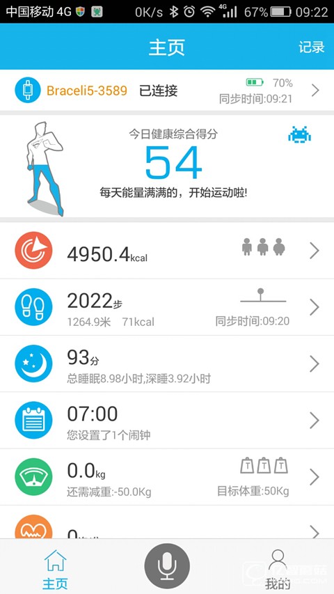 綁定成功后,手環(huán)會(huì)自動(dòng)同步手機(jī)上的時(shí)間日期,并在主頁上顯示運(yùn)動(dòng)、睡眠、卡路里等記錄。