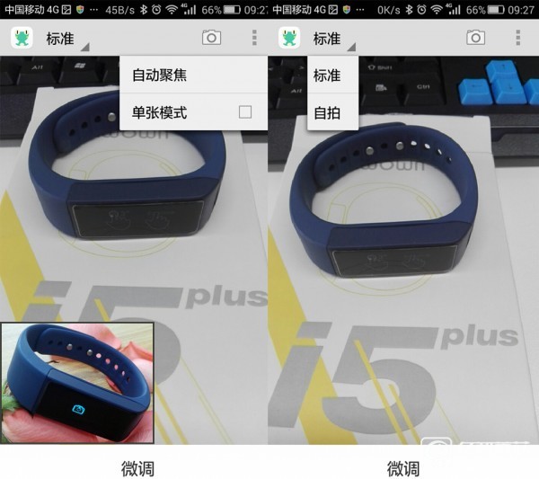 記錄里還有一個(gè)智拍功能,相比I5,功能更加強(qiáng)大了,當(dāng)點(diǎn)擊此按鈕時(shí),手環(huán)會(huì)進(jìn)入拍照模式,并支持自動(dòng)對焦和微調(diào),點(diǎn)擊手環(huán)上面的圖標(biāo),手機(jī)就可以自動(dòng)拍照,自拍控必備。