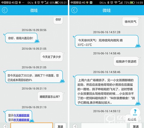 還有一個(gè)比較贊的功能,在“埃微健康助手”下方,有個(gè)小話筒,點(diǎn)擊進(jìn)去可以和微哇交流,功能類似于蘋果上的siri,甚至比siri還強(qiáng)大!你可以語音查詢運(yùn)動(dòng)步數(shù)、睡眠數(shù)據(jù)等,關(guān)于手環(huán)的一切你都可以用文字或者語音的形式詢問她,微哇會(huì)詳細(xì)解答。當(dāng)然除了這些,你還可以詢問當(dāng)?shù)氐奶鞖狻?shù)學(xué)題、日期、講笑話等等,還有,如果你是一只單身狗,你可以盡情的撩妹。
