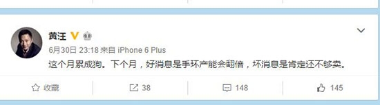 華米CEO黃汪曾表示,小米手環2將于10月發布,并在7月將產能翻倍愛,近日黃汪發文稱小米的產能總算翻倍了,但是還是表示初期會不購買!并且小米在發布時曾稱市價將為一部149元,但是應為上市初期供不應求,所以可能將價格吵到229,本同為米粉,相煎何太急!