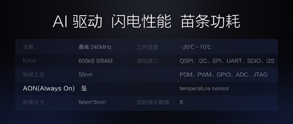 此外,“黃山1號”是全球首款集成AI神經網絡模塊的可穿戴處理器,也是全球首款RISC-V開源指令集可穿戴處理器,擁有AI驅動、閃電性能、苗條功耗三大特點,應用了Always on技術,區別于傳統AI,實現了AI從云到端的前移,實時計算無需傳輸。相比Arm Cortex-M4架構處理器運算效率高出38%。