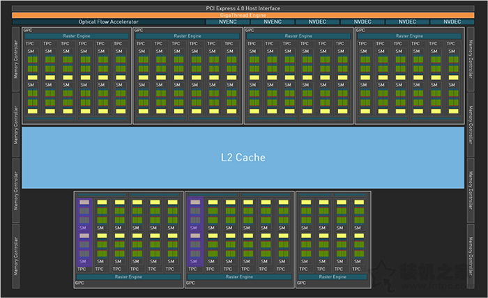 通過AD103核心架構圖,我們可以看到,AD103核心自身采用了非對稱設計,完整規格的AD103應該是7組GPC,40組TPC以及80組SM單元,每一組SM單元擁有128個CUDA核心,整個核心擁有10240個CUDA核心,同時搭載了320個Tencor Core、80個RT Core以及112個ROPs,L2緩存則為64MB。