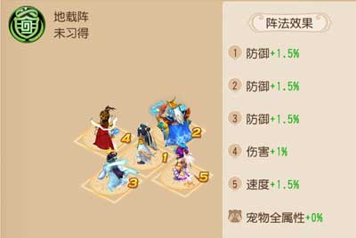 地載陣(三防1傷1速):注重防御的陣法,比較適合控制或輔助型職業(yè),5號(hào)位上提升速度建議使用封印型伙伴,通過(guò)不但的控制和消耗磨死對(duì)手。
