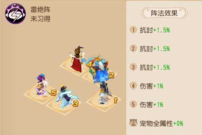 雷絕陣(3抗封2傷):同樣是針對(duì)型的陣法,比較克制方寸山和獅駝嶺,在一些特殊戰(zhàn)斗或PK中有奇效。