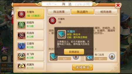 每個(gè)陣法都有5個(gè)等級(jí),可以通過(guò)相應(yīng)的陣法書來(lái)提升,提升陣法等級(jí)可以增加法陣中各各陣位的屬性加成,大大提升我方戰(zhàn)斗力,尤其是一些特殊陣法,只有達(dá)到高等級(jí)之后,才能發(fā)揮其真正的效果,所以不要盲目的收集陣法,專心升級(jí)2~4個(gè)即可。另外,我們還可以使用奇門法竅來(lái)增強(qiáng)陣法中出戰(zhàn)寵物的屬性。
