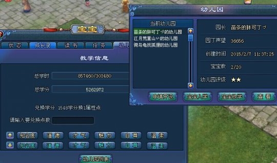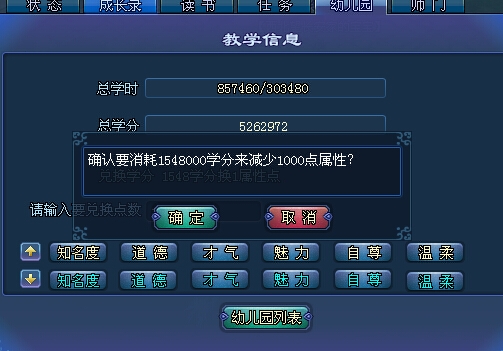 在幼兒園學習可以獲得學分,學分用來提高或者降低道德才氣balabala一堆的數值,假如,我寶寶才氣是2000,但是小昭氣場的才氣要求在400到1000之間,這時候就用學分來降低才氣