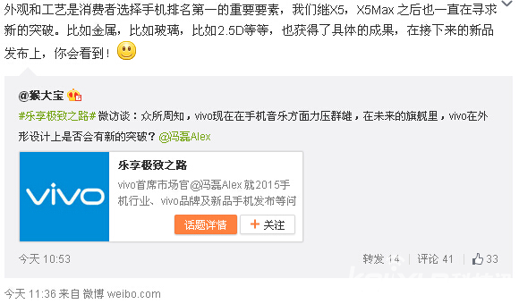 vivo官微曝光新機信息:主打外觀 或為Xplay5S