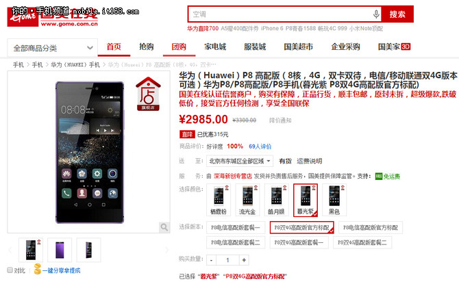 華為P8是華為今年主打的旗艦機型,而高配版的華為P8是則擁有三個版本中最頂級的配置,可以說是國產旗艦中頗具亮點的一款。目前在華為官方商城銷售火爆,仍需要在每周一、三、五進行搶購才能入手。而現在我們欣喜的看到國美在線中高配版華為P8現貨爆出2985元的超低價格,相比原價3588元還優惠六百元,有意購買P8的朋友此時可以選擇入手了。
