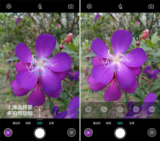 體驗方面,樂Max Pro的拍攝界面還是相當(dāng)簡約,類似iPhone一樣,左右滑動可以選擇固定在底部的四個拍攝功能。此外,在拍攝功能選擇欄處,向上滑動還能選擇更多的拍攝功能。