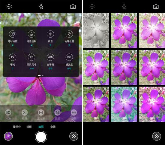 點擊左上角的國標(biāo)可以打開相機菜單,可以簡單選擇拍攝聲音和白平衡等設(shè)置項目。此外,點擊右下角能喚醒濾鏡拍攝功能。總的來說,操作體驗還是與大部分機型類同,很容易上手。