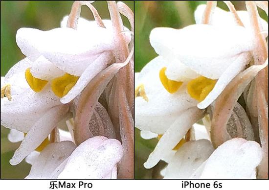 微距方面,樂Max Pro的解析力同樣要比iPhone 6s好。如,上圖的微距對比樣張,放大后可發(fā)現(xiàn),樂Max Pro拍攝的花朵的細(xì)節(jié)要明顯比iPhone 6s好。這應(yīng)該是樂Max Pro高像素優(yōu)勢的直接體現(xiàn)。