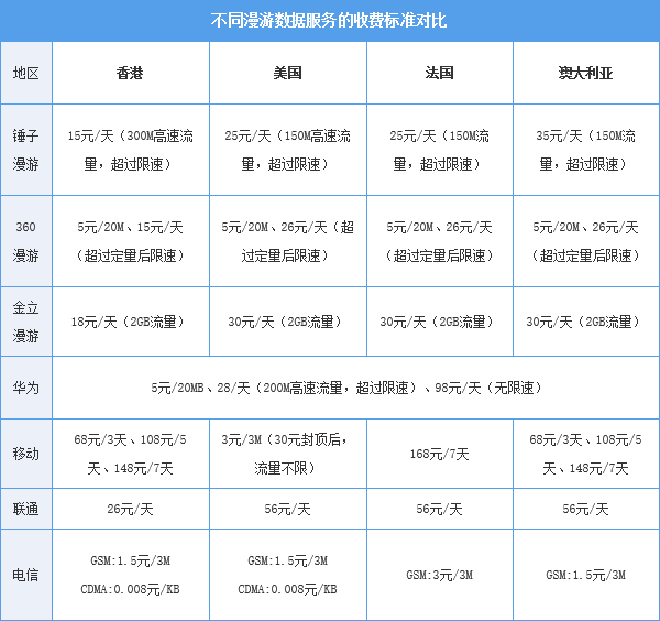 此外,金立、奇酷等廠商提供的漫游服務(wù)都和錘子漫游相似,所以在此就不再過(guò)多介紹。而華為天際通的功能則要更加豐富,除了漫游流量外,天際通還提供了100萬(wàn)個(gè)海外免費(fèi)熱點(diǎn)連接的“全球WLAN”服務(wù)。而關(guān)于資費(fèi)方面,小編也簡(jiǎn)單整理了不同漫游服務(wù)的收費(fèi)標(biāo)準(zhǔn)。