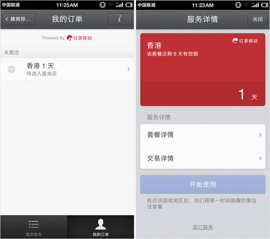 成功購(gòu)買(mǎi)后,我們可以在漫游服務(wù)的功能菜單中找到相應(yīng)的訂單。而當(dāng)我們出境進(jìn)入服務(wù)區(qū)后,錘子漫游服務(wù)會(huì)激活相應(yīng)的套餐,而我們只需進(jìn)入訂單頁(yè)面點(diǎn)擊 ‘開(kāi)始使用’即可使用。值得一提的是,該漫游服務(wù)并不用更換SIM卡,甚至無(wú)SIM卡也可以使用,所以并不影響原來(lái)SIM卡的使用(可關(guān)閉原SIM卡的移 動(dòng)流量數(shù)據(jù),避免產(chǎn)生額外費(fèi)用)。