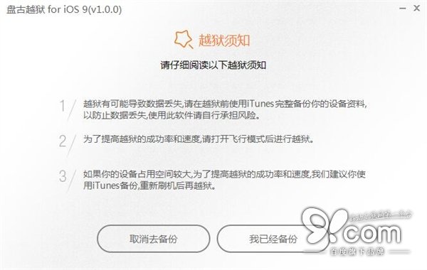 2. 請仔細閱讀【越獄須知】后,點擊【我已經備份】進入下一步(注:上面有提高多,如果沒有備份的用戶建議先備份)