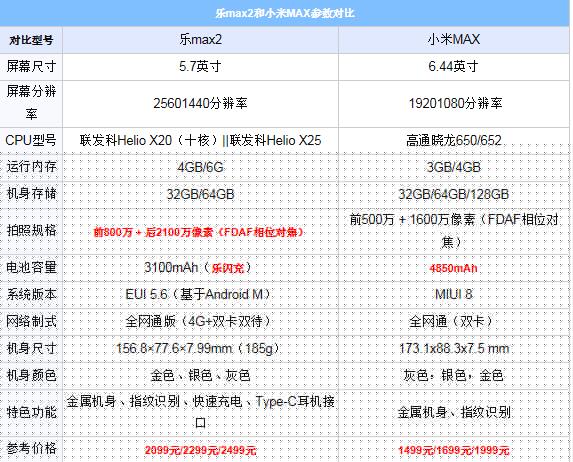 先來看看樂max2和小米MAX硬件配置對比,參數黨必看: