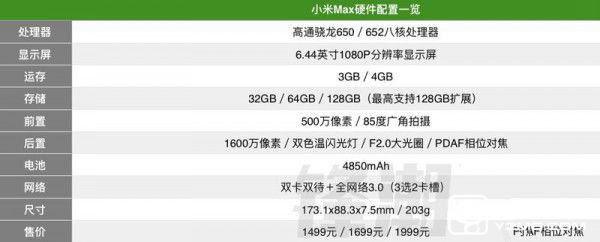 首先我們來了解下硬件配置,小米Max配置了一塊6.44英寸的1080P分辨率屏幕,分別有搭載高通驍龍650/652處理器兩種版本,輔以3GB/4GB運存+32GB/64GB/128GB存儲空間配置。攝像頭采用前置500萬+后置1600萬像素組合,后置攝像頭擁有F2.0大光圈、5P鏡組和PDAF相位對焦技術(shù)。該機支持雙卡雙待全網(wǎng)絡(luò)制式(全網(wǎng)通3.0),三選二卡槽設(shè)計,擁有紅外線遙控功能,內(nèi)置4850mAh電池、后置指紋識別,且搭載基于Android 6.0定制的MIUI 8.0操作系統(tǒng)。