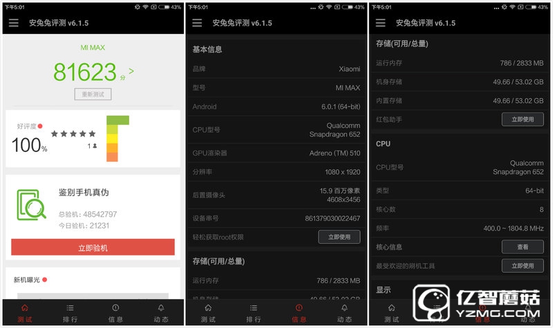 安兔兔評測跑分成績81623分(驍龍652+3GB RAM版本)