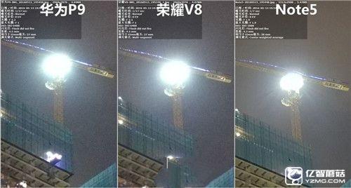 鏡頭炫光眩光控制方面,榮耀V8和華為P9面對強光源時,“光球”范圍要比Note5大一圈,但眩光控制還可以。