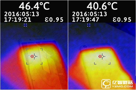 游戲30分鐘后,機身正面最高溫出現在左上角,為46.4度。背面最高溫出現在指紋識別模塊上方,為40.6度,表現中規中矩。