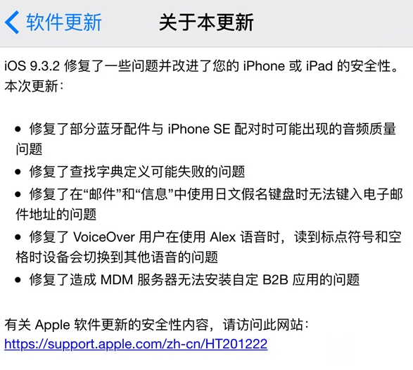 iOS 9.3.2正式版更新了什么功能,修復了部分藍牙配件與iPhone SE配對時可能出現的音頻質量問題;...