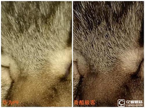 放大至100%之后,和之前的表現不同,華為P9在貓毛上的細節不及奇酷極客,后者的細節更加豐富,但暗部有明顯的涂抹痕跡。