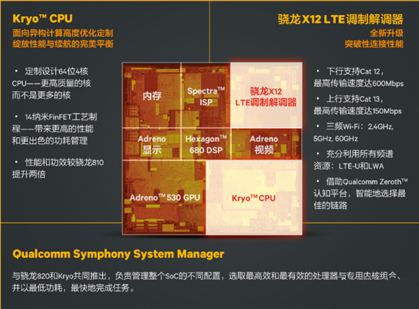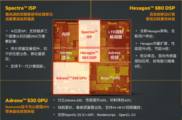 驍龍820主要由Kryo CPU、Adreno 530 GPU、Spectra ISP、Hexagon 680 DSP和驍龍X12 LTE調(diào)制解調(diào)器組成。SoC內(nèi)部通過(guò)Qualcomm Symphony System Manager進(jìn)行統(tǒng)籌,合理調(diào)度各個(gè)模塊進(jìn)行運(yùn)算并獲得最高能效比。驍龍820給我們最大的印象就是充分體現(xiàn)了分工合作的異構(gòu)計(jì)算思想,CPU負(fù)責(zé)通用計(jì)算部分,GPU專注圖形處理過(guò)程,ISP鉆研拍照時(shí)候各種算法,DSP統(tǒng)籌各種內(nèi)部傳感器,驍龍X12 LTE調(diào)制解調(diào)器讓網(wǎng)絡(luò)傳輸速度更快,兼?zhèn)銿oLTE、4G+和全網(wǎng)通等特性。
