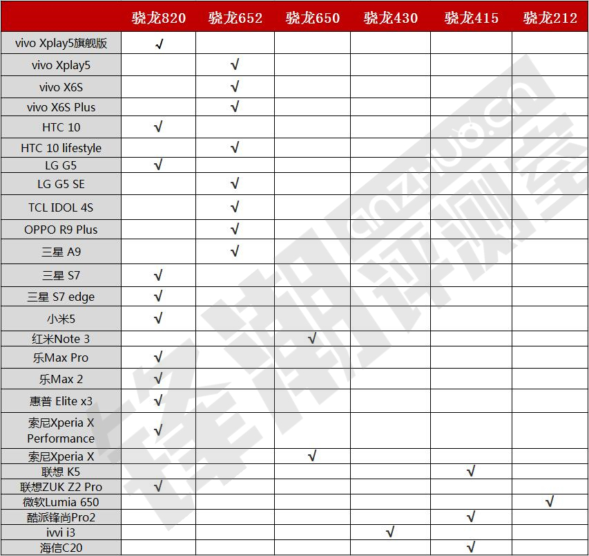 如上圖所示,這就是16年前四個(gè)月Qualcomm旗下6款最新最熱門(mén)的處理器所搭載的機(jī)型一覽表。旗艦級(jí)別有驍龍820和驍龍652兩款處理器加持,中高端級(jí)別則交給驍龍652和驍龍650把關(guān),中端市場(chǎng)則繼續(xù)由上年年底開(kāi)始發(fā)力的驍龍616和驍龍617看守,中低端市場(chǎng)則留給驍龍430、驍龍415和驍龍212開(kāi)疆拓土。