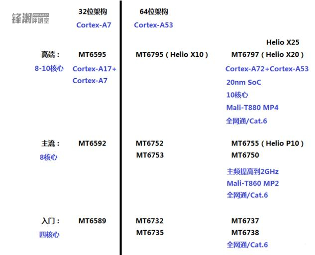 作者先將32位架構(gòu)和64位架構(gòu)的處理器楚河漢界劃分開(kāi)來(lái),在32位架構(gòu)時(shí)代,Cortex-A7架構(gòu)是聯(lián)發(fā)科摯愛(ài)。而在64位架構(gòu)時(shí)代,Cortex-A53架構(gòu)成為了新寵。當(dāng)然每個(gè)時(shí)期頂級(jí)的處理器依然會(huì)采用更高能效比的核心,例如32位時(shí)期的Cortex-A17和64位時(shí)期的Cortex-A72。