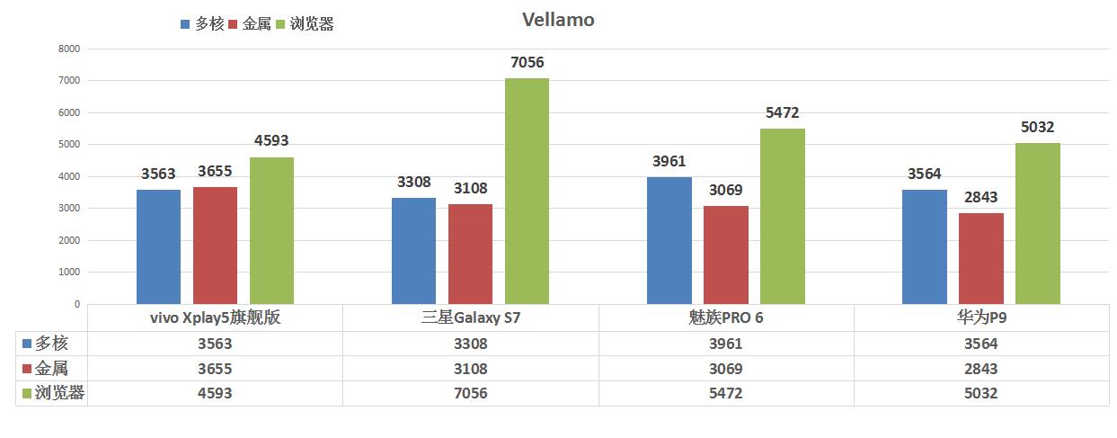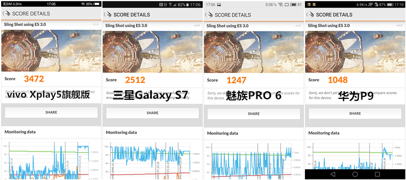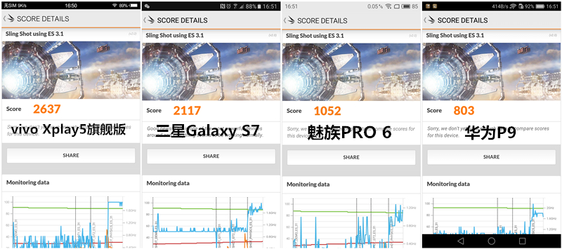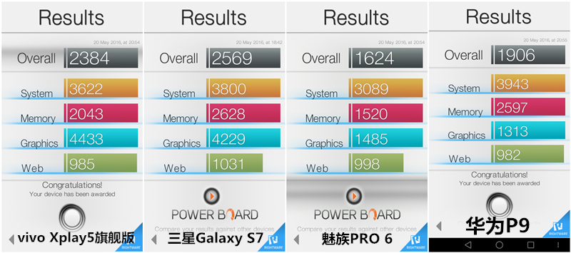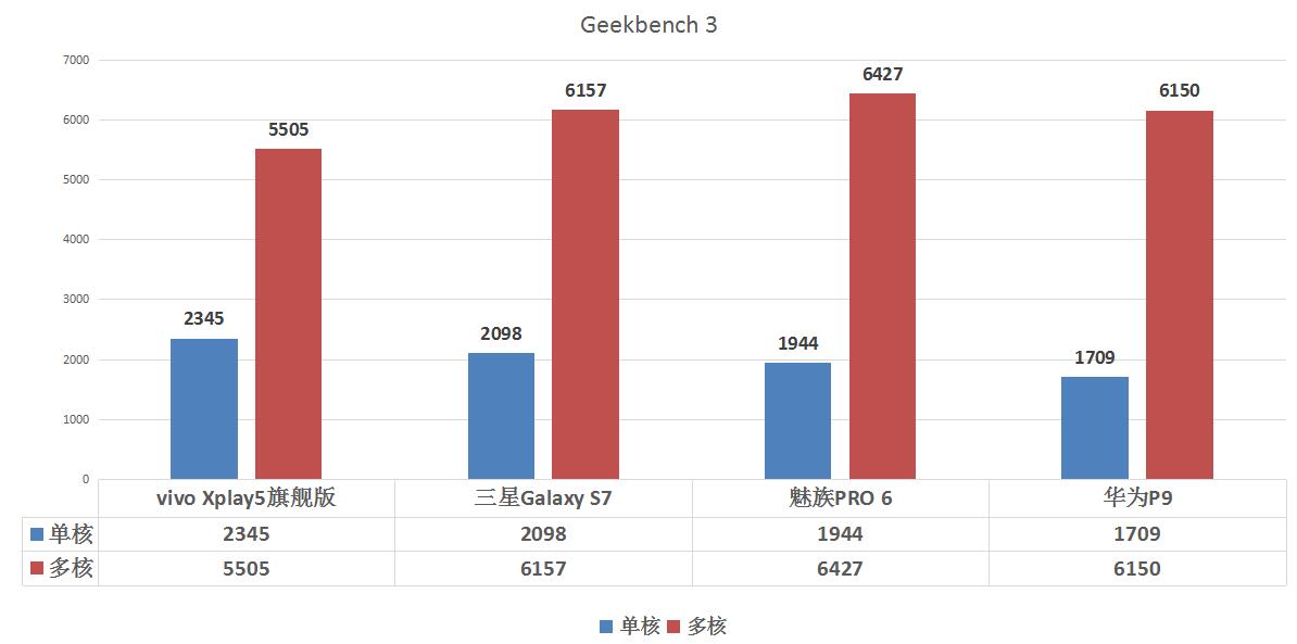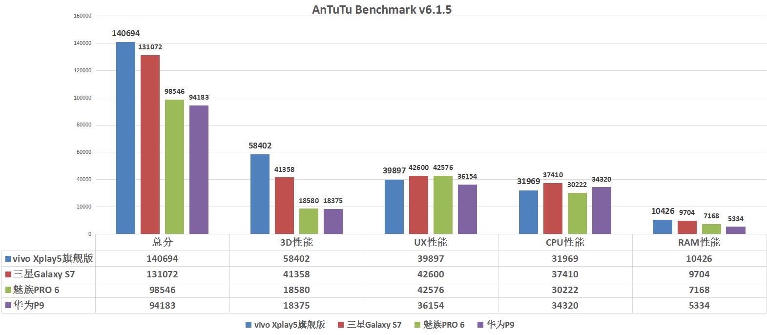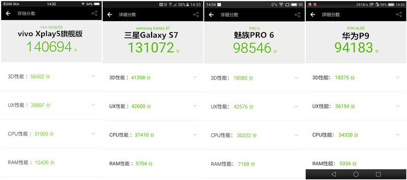 性能測(cè)試結(jié)果:vivo Xplay5旗艦版>三星Galaxy S7>魅族PRO 6> 華為P9