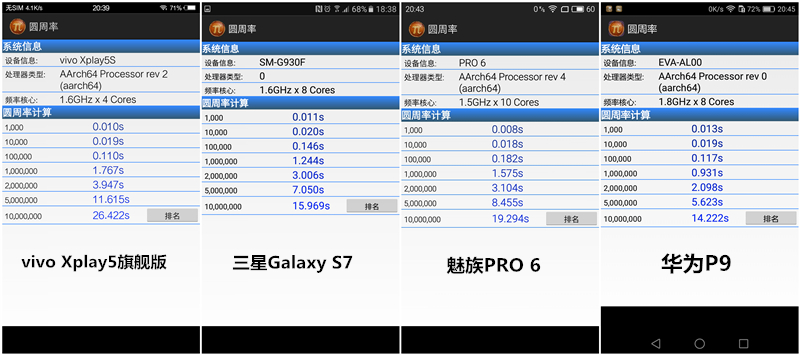 (多核)魅族PRO 6>三星Galaxy S7>華為P9>vivo Xplay5旗艦版