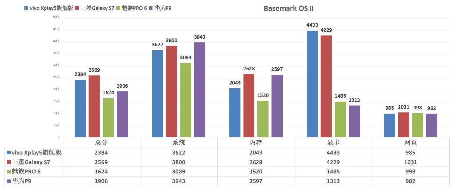 我們最后用basemark OS II這個(gè)軟件來(lái)對(duì)今天評(píng)測(cè)的4臺(tái)機(jī)子來(lái)個(gè)綜合的評(píng)分,雖然結(jié)果各有各自家特長(zhǎng),但從總體上看,得分排前列的依舊都是vivo Xplay5旗艦版和三星Galaxy S7,可見(jiàn)得Exynos 8890、驍龍820面對(duì)現(xiàn)今當(dāng)紅高端悍將麒麟955和Helio X25依舊能閑庭信步地面對(duì)毫不畏懼!