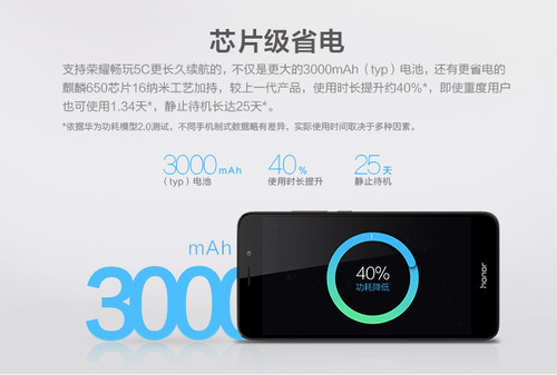 榮耀暢玩5C在電池容量上是最少的,3000mAh容量在其他三款機型面前顯得有點單薄。不過可別忘了這款手機還有一個殺手锏,那就是16nm制程工藝的麒麟650芯片,這款處理器在功耗上的優化相當之出色,我之前對它的續航進行過測試,最終的表現確實令我意外。