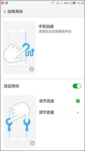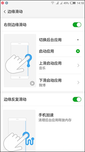 至于大家熟悉的努比亞“邊緣手勢”功能,nubia Z11 mini也得到了保留。它支持左側邊緣滑動、右側邊緣滑動、邊緣反復滑動以及雙邊滑動四種操作方式。能實現切換后臺應用、啟動應用、手動加速等功能或操作。事實上,用戶還可以手動調整其觸發功能,從而最大化的發揮“邊緣手勢”的優勢。