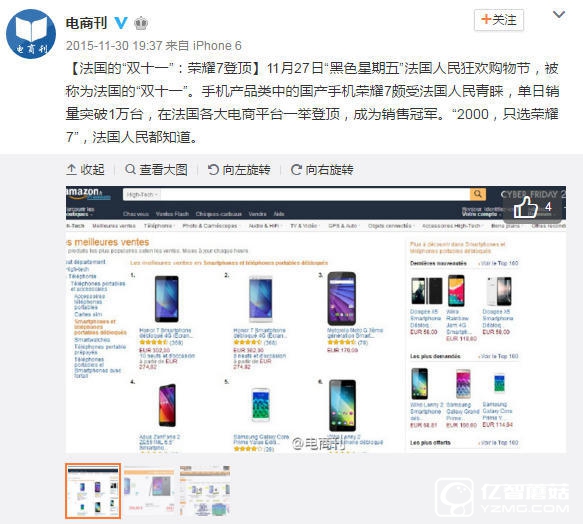 榮耀的高好評,好口碑并不是沒有道理的。榮耀的產品除了在中國大量銷售,還在全球74個國家和地區銷售,其中歐洲和美國就有大量銷售。在法國去年的“雙11”,電商銷售第一名,如下圖所示: