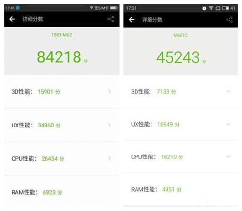 左圖為360手機(jī)N4跑分成績,右圖為魅藍(lán)Note3跑分成績