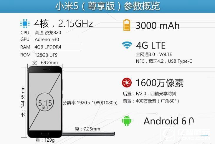 下面我們通過一張圖來簡單看一下小米5(尊享版)的配置。