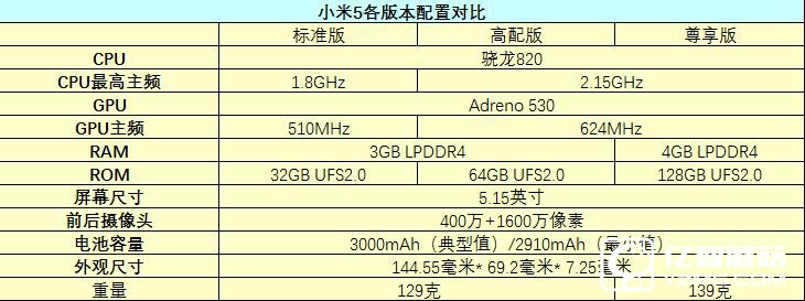 小米5此次有三個版本。機(jī)身材質(zhì)和配置都不盡相同。以下表格較為直觀的列出了小米5三個版本之間的一些不同。