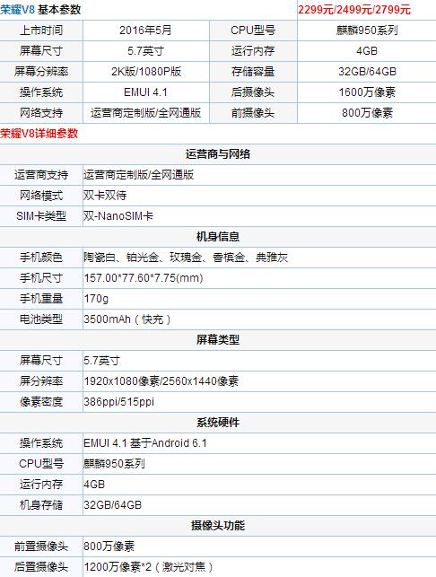 文章最后附上ZUK Z2和榮耀V8詳細參數,想要全面了解這款手機各個參數細節方面的朋友,不妨詳細看看。